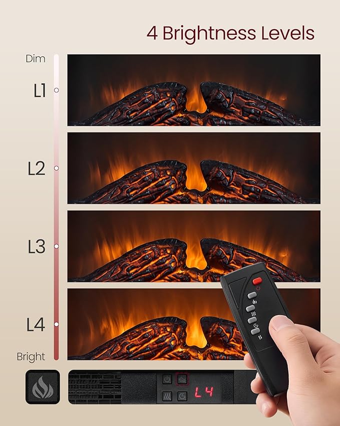 - Cozy Warmth, Inviting Ambiance: Create your ideal retreat with the 18" electric fireplace, offering 10 temperature settings and 4 flame brightness levels. Easily set the perfect atmosphere for movie nights or gatherings—all with the remote or touch panel