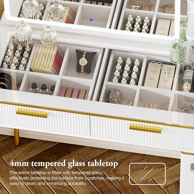 - 【3-Color LED Light】The vanity desk features a specially shaped dimmable lighting mirror with 3 different LED lighting colors, including natural, warm and cool light, for a variety of indoor lighting and environments to optimize your makeup