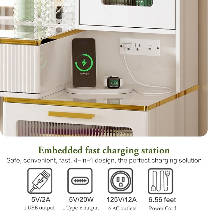 - 【Built-in Power Strip】Upgrade design!This makeup table equipped with a power strip that has 2 standard plug sockets ,1 USB ports and 1 T-C with a 4.9-foot power cord,convenient for the LED lights,hairdryer, curling iron, and charge your phone, tablet, or other electronics。