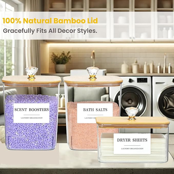 - 【Acrylic Crystal Knob & 12 PCS Labels】Our large laundry powder container is equipped with stylish and attractive handle, which not only enhances the aesthetics of the plastic laundry organizer jar but also provides a comfortable grip, making the lid easy to open and close. The 12 labels feature clear categorization, waterproof, easy peeling, and no adhesive residue, making it easy to organize laundry room items.