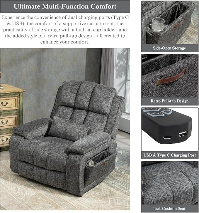 - USB & Type C Charging Ports - Stay connected with built-in USB & Type C charging ports, conveniently integrated into the position remote. Charge your devices without ever leaving your seat, making it easy to keep your phone, tablet, or other devices powered up while you relax