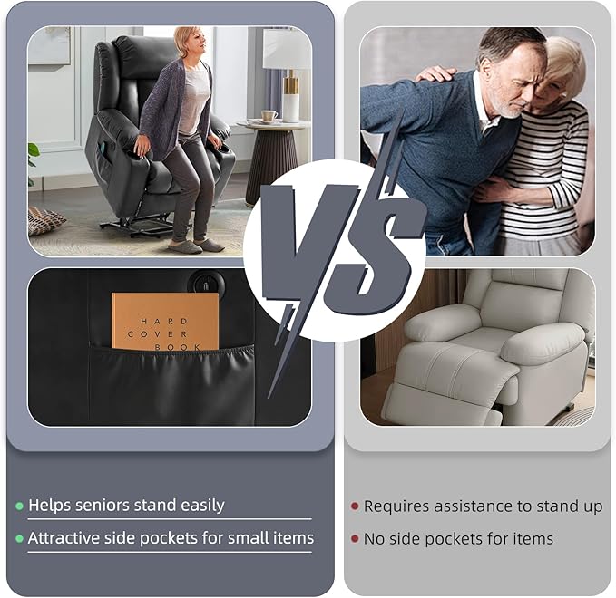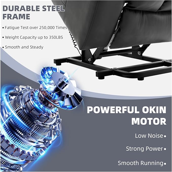 - [Electric lifting and standing assistance]Our balance lifting mechanism is driven by a powerful German OKIN motor, providing seamless standing assistance. Smoothly enhancing the overall stability of the chair, allowing users to effortlessly ascend without putting pressure on their back or knees. This feature is particularly beneficial for elderly people, pregnant women, or those who have difficulty standing from a sitting position