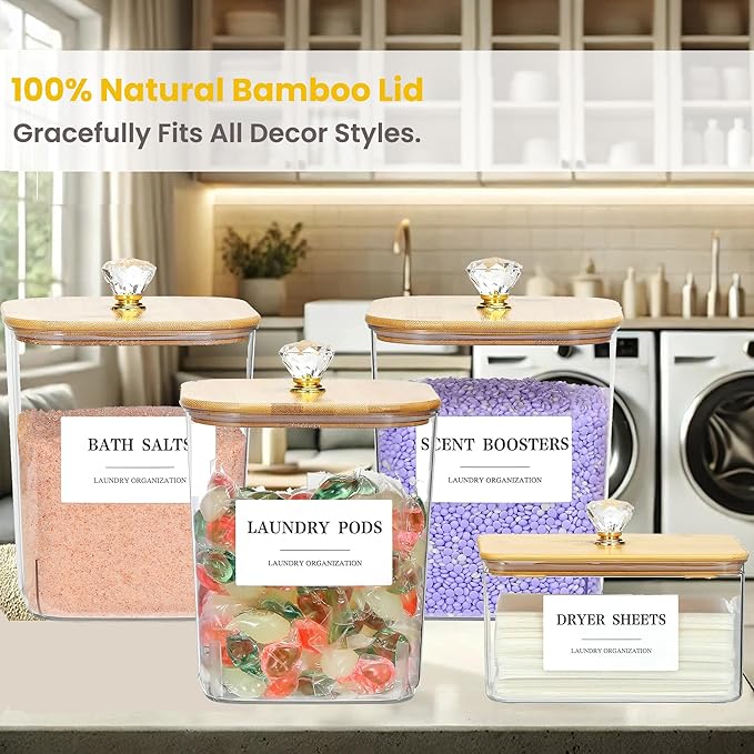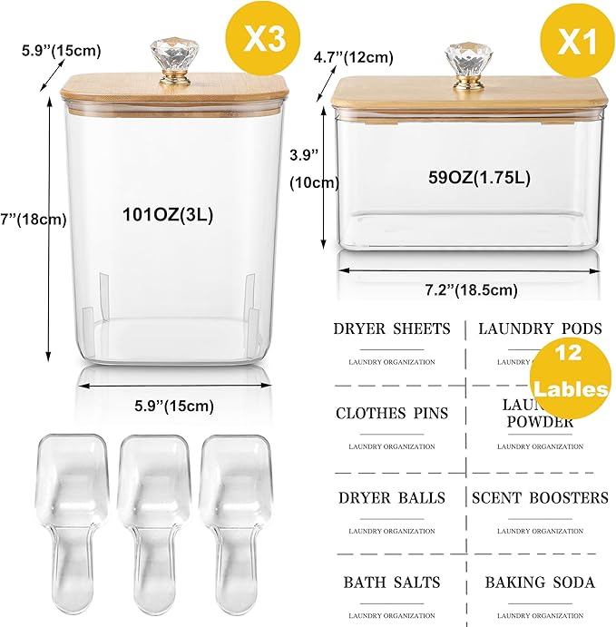 4 Pack Clear Laundry Pods Container & Dryer Sheet Holder Set with Lid, Laundry Containers with Scoops & Labels, Laundry Room Organization and Storage for Laundry Detergent, Pods, Powder, Beads