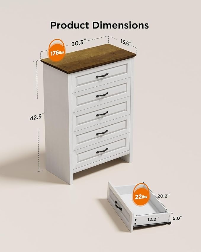 - Exceptional Weight Capacity & Ideal Size: Built from high-density engineered wood, this dressers & chests of drawers supports up to 176 lbs, providing a sturdy and reliable storage solution. (30.3” W x 15.7” D x 42.7” H)—a space-saving design that maximizes storage without taking up too much room.