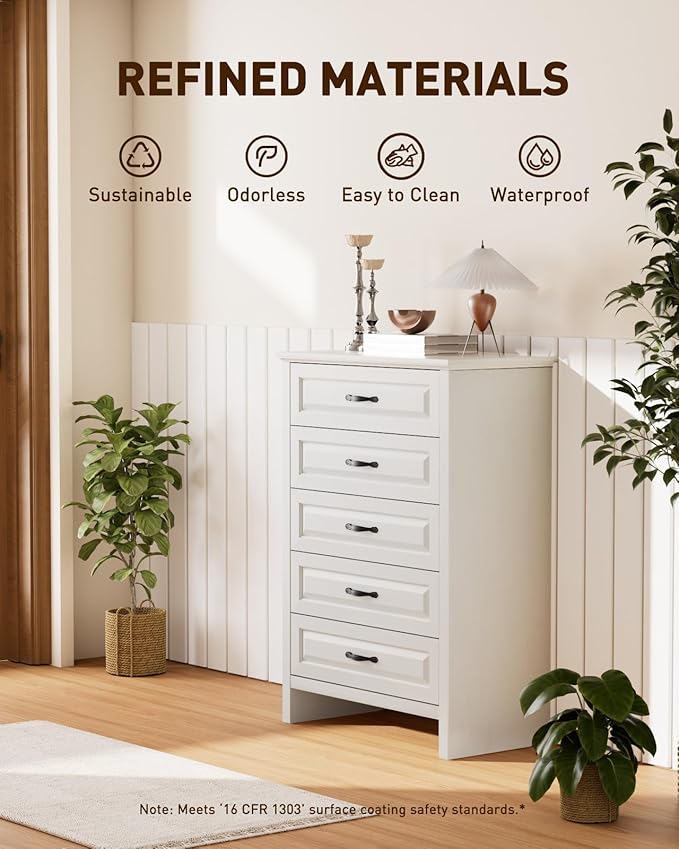 - SAFE, SUSTAINABLE & EASY TO CLEAN: Made with eco-friendly, odor-free materials that meet CARB and EPA air safety standards, this dresser helps you create a healthier living space. The water-resistant finish is easy to wipe clean, keeping your furniture fresh and low-maintenance for years to come.