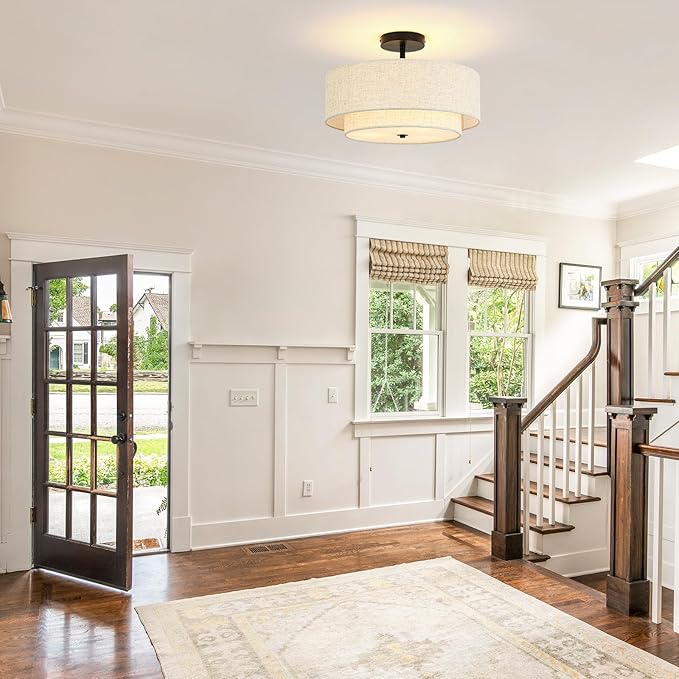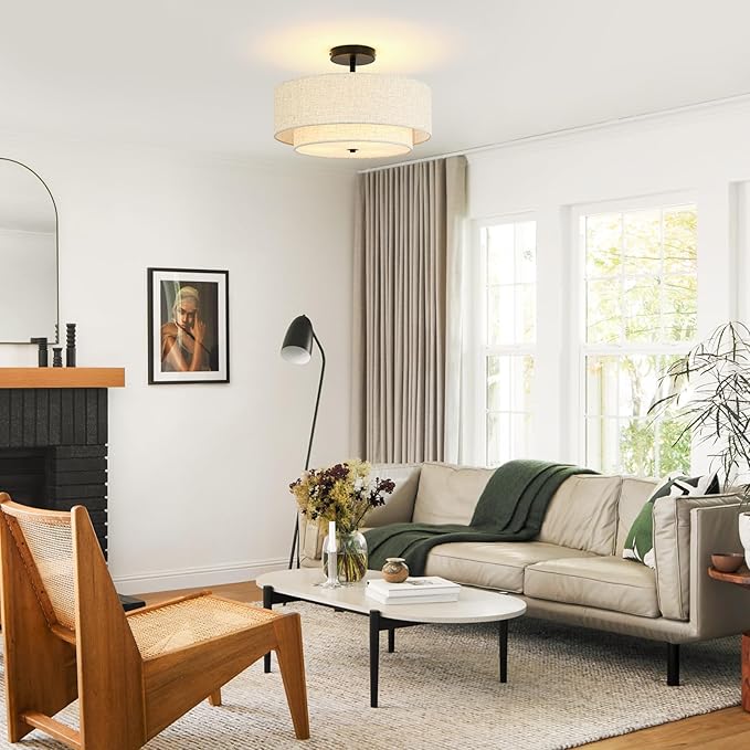 - Elegant Dual Drum Design - Adding a touch of sophistication to any room, the black semi-flush mount ceiling light features a unique dual drum design. The combination of a soft inner shade and a linen fabric outer shade with matte black metal creates a timeless look that suits both modern and traditional interiors, creating a charming and warm classic atmosphere for your space.