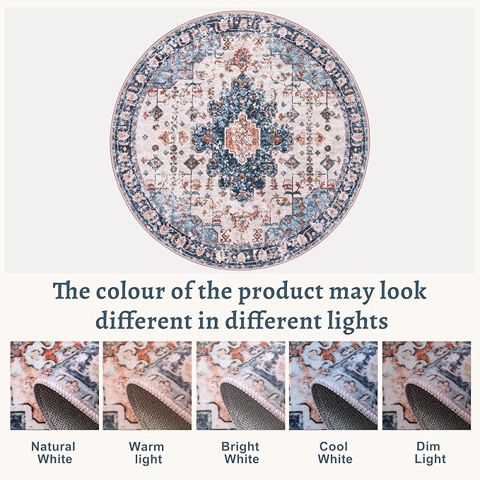Tangsoo Vintage Round Rug 5ft,Washable Circle Rug, Non Slip Boho Round Area Rug, Low Pile Circular Rugs, Round Carpet for Bedroom,Livingroom,Nursery,Dorm,Office,Blue/Orange