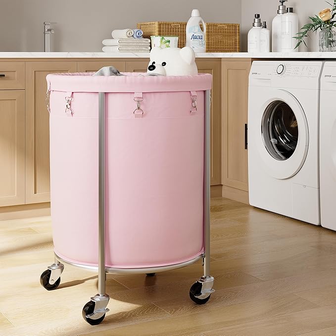 ELYKEN Laundry Basket with Wheels, 170L Rolling Laundry Hamper with Removable Bag and Steel Frame, Round Laundry Cart with 4 Casters and 2 Brakes, Ideal for Bedroom, Bathroom, Laundry Room, Pink