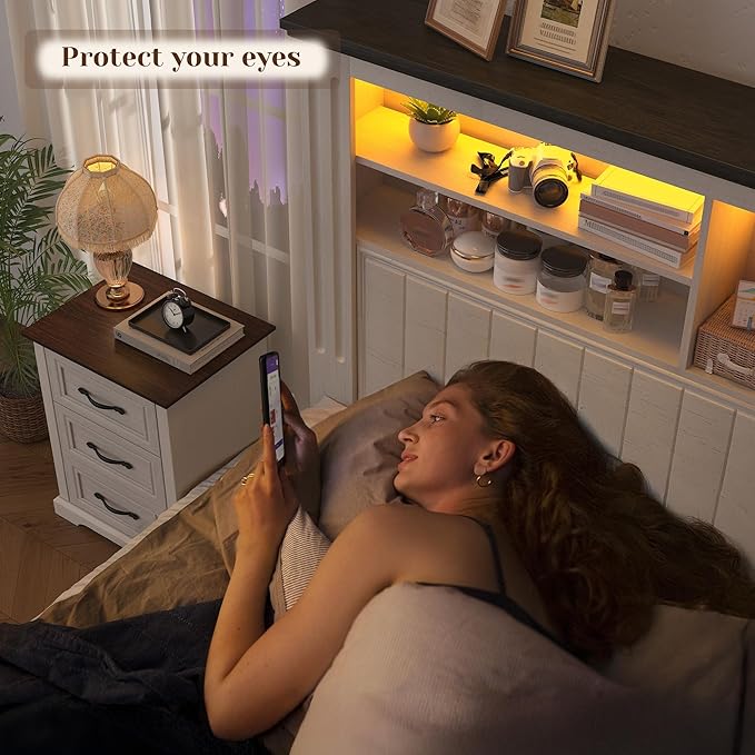 EnHomee Full Size Bed Frame with Headboard and Storage, 4 Drawers and LED Built in Charging Station Full Bed Frame with Storage Farmhouse,NO Noise,No Box Spring Needed,White