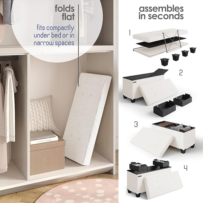 - Durable Fabric Ottoman: Organize essentials and accessories with this multipurpose storage ottoman bench that provides you with a comfortable seat for putting on socks and shoes, while making a statement as an end of bed storage bench or entry bench with storage.