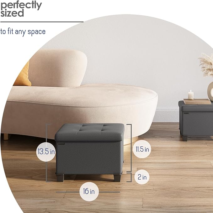 - Removable Legs: Our ottoman with storage for bedroom measures 11.5” L x 16” W x 10.5” H and folds flat when not in use. Adjust the height by adding or removing sturdy 2" legs.