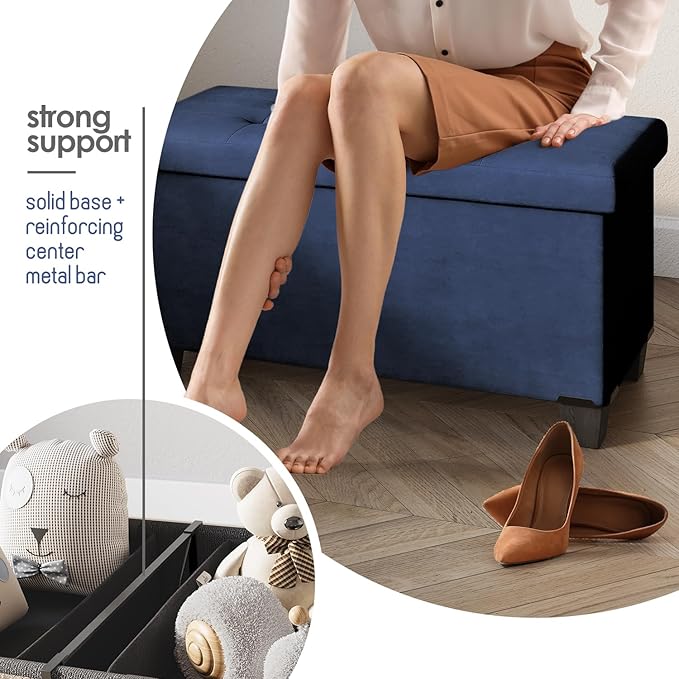 STORAGEBUD Storage Ottoman Bench with Bins, 30-in Storage Bench for Bedroom End of Bed, Folding Foot Rest Ottoman for Living Room Max 660lbs, Velvet Ottomans, Blue
