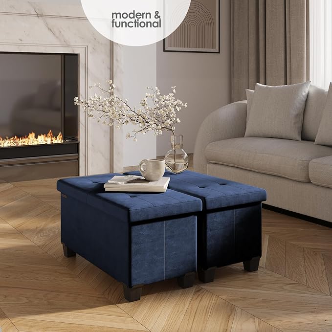 - Removable Legs: Our ottoman storage bench for bedroom and kids’ room can fold flat when not in use and measures 30” L x 15" D x 15” H when fully expanded. Adjust the height by adding or removing sturdy 2" legs, adapting this blue ottoman to suit your storage needs.