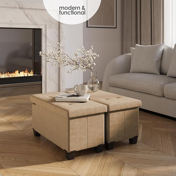 - Removable Legs: Our ottoman storage bench for bedroom and kids’ room can fold flat when not in use and measures 30” L x 15" D x 15” H when fully expanded. Adjust the height by adding or removing sturdy 2" legs, adapting this taupe ottoman to suit your storage needs.