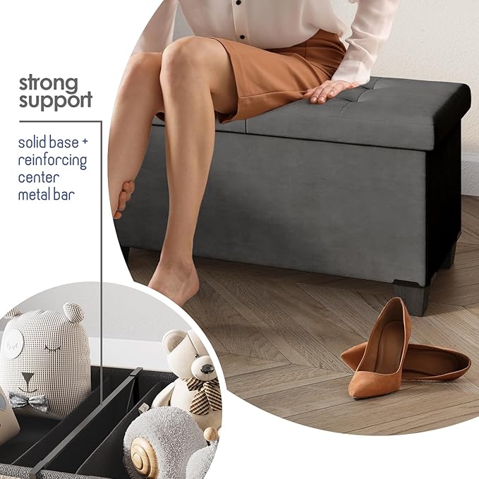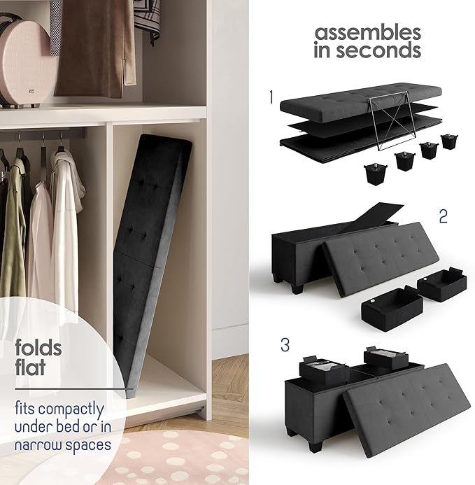 - Durable Velvet Ottoman: Organize essentials and accessories with this multipurpose storage ottoman bench that provides you with a comfortable seat for putting on socks and shoes, while making a statement as an end of bed storage bench or entry bench with storage.