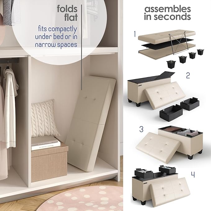 STORAGEBUD Storage Ottoman Bench with Bins, 30-in Storage Bench for Bedroom End of Bed, Folding Foot Rest Ottoman for Living Room Max 660lbs, Faux Leather Ottomans, Beige