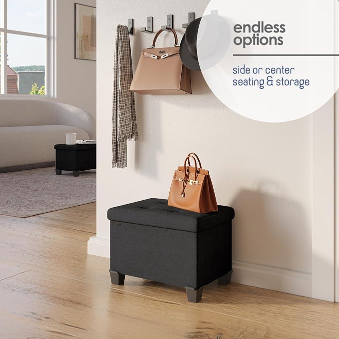 - Removable Legs: Our ottoman with storage for bedroom measures 11.5” L x 16” W x 10.5” H and folds flat when not in use. Adjust the height by adding or removing sturdy 2" legs.