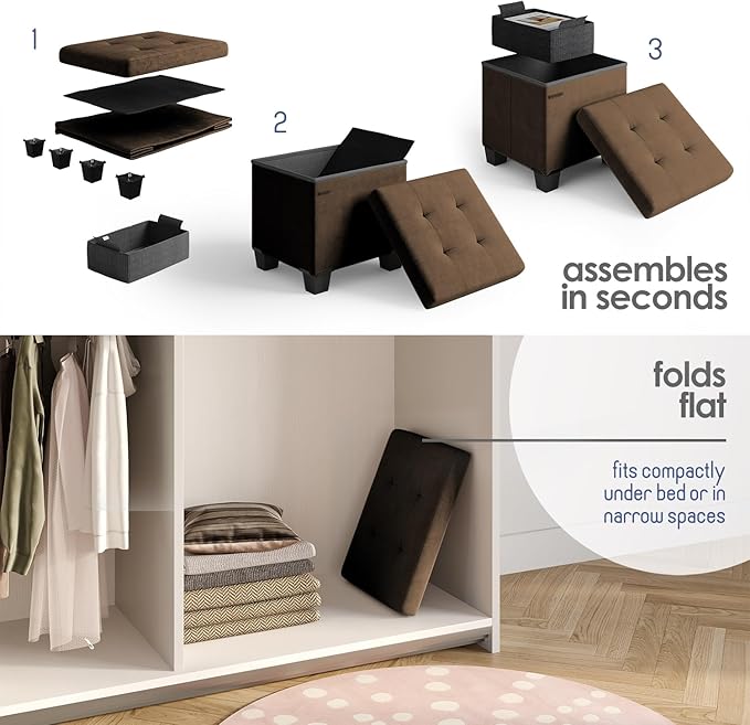 - Removable Legs: Our ottoman with storage for bedroom measures 15” L x 15” W x 15” H and folds flat when not in use. Adjust the height by adding or removing sturdy 2" legs.