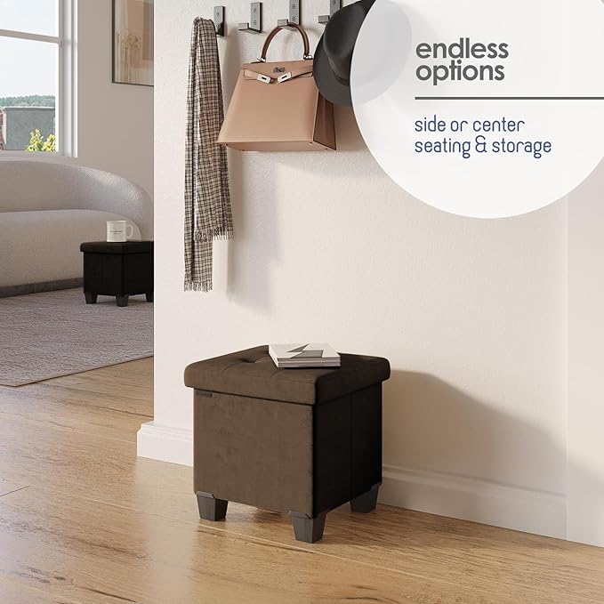 STORAGEBUD Storage Ottoman Cube with Small Bin, 15-in Square Ottoman with Storage for Living Room and Bedroom, Small Ottomans Foot Rest, Velvet Foot Stools Ottomans Max 330lbs, Brown
