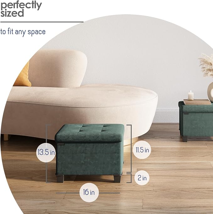 STORAGEBUD Storage Ottoman Cube with Small Bin, 16-in Square Ottoman with Storage for Living Room and Bedroom, Small Ottomans Foot Rest, Velvet Foot Stools Ottomans Max 330lbs, Green