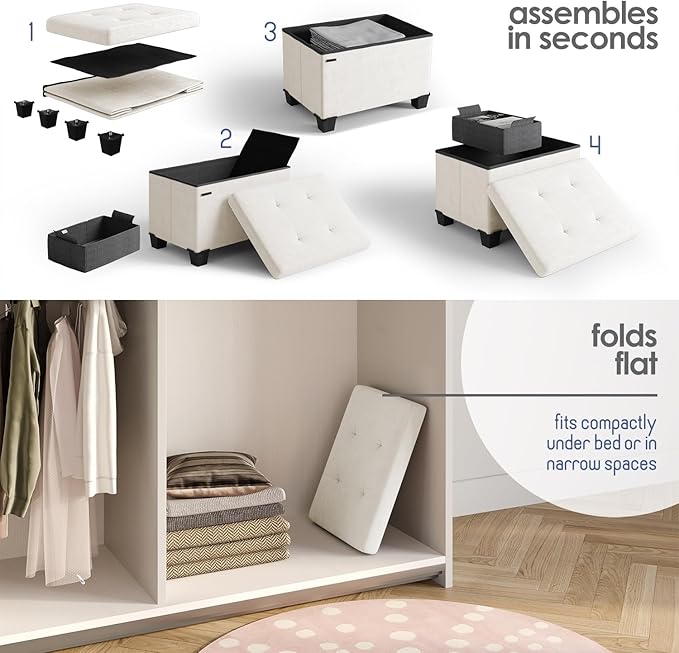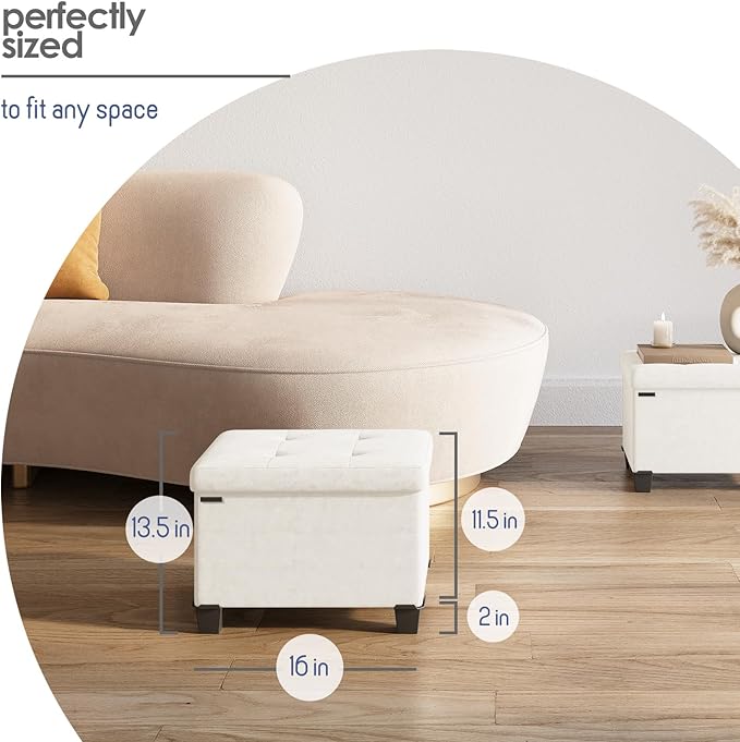 - Removable Legs: Our ottoman with storage for bedroom measures 16” L x 11.5” W x 10.5” H and folds flat when not in use. Adjust the height by adding or removing sturdy 2" legs.