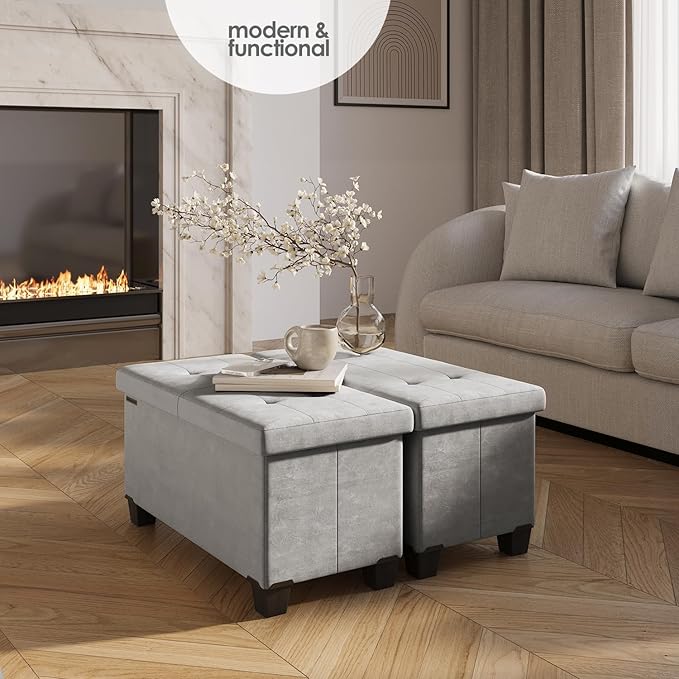 - Removable Legs: Our ottoman storage bench for bedroom and kids’ room can fold flat when not in use and measures 30” L x 15" D x 15” H when fully expanded. Adjust the height by adding or removing sturdy 2" legs, adapting this light gray ottoman to suit your storage needs.