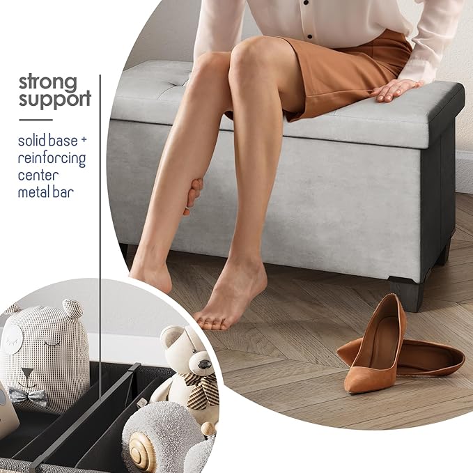 - Sturdy, Stable Lid: The cushioned lid of our ottoman with storage for bedroom is comfortable and supportive, with an invisible hinge design that allows it to be bent and lifted up from either side without removing the entire lid.