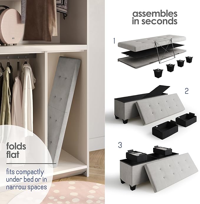 - Durable Velvet Ottoman: Organize essentials and accessories with this multipurpose storage ottoman bench that provides you with a comfortable seat for putting on socks and shoes, while making a statement as an end of bed storage bench or entry bench with storage.