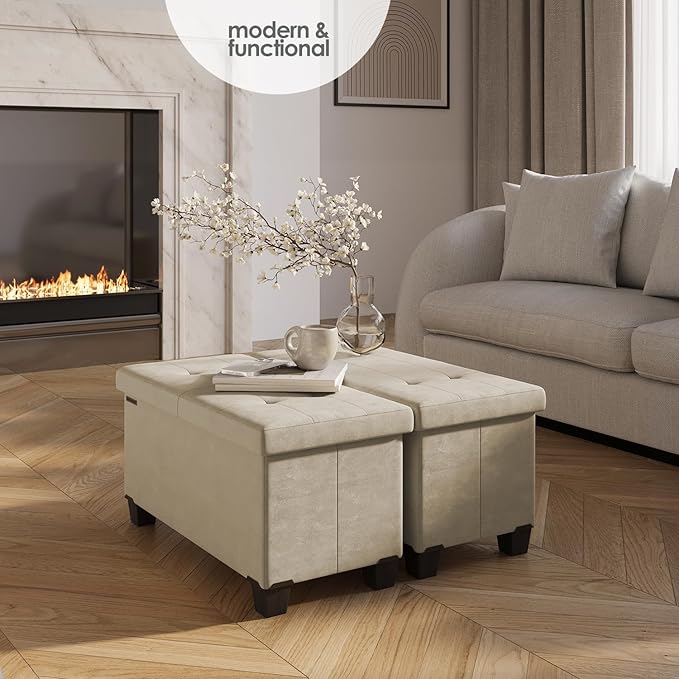 - Removable Legs: Our ottoman storage bench for bedroom and kids’ room can fold flat when not in use and measures 30” L x 15" D x 15” H when fully expanded. Adjust the height by adding or removing sturdy 2" legs, adapting this beige ottoman to suit your storage needs.