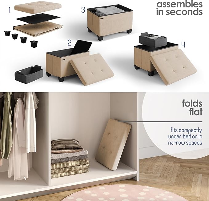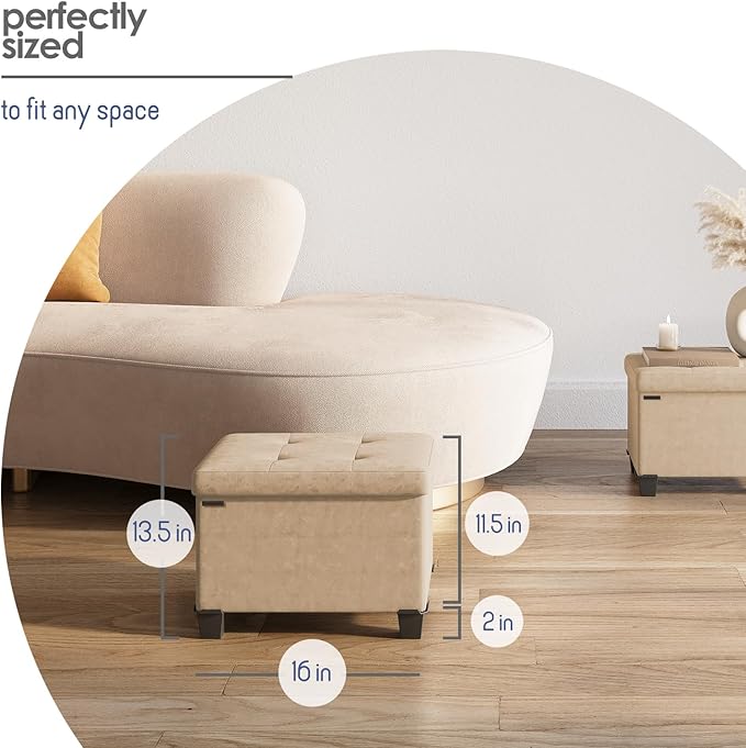 - Removable Legs: Our ottoman with storage for bedroom measures 16” L x 11.5” W x 10.5” H and folds flat when not in use. Adjust the height by adding or removing sturdy 2" legs.