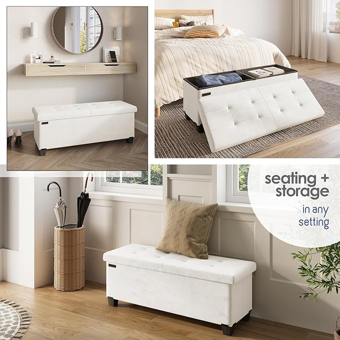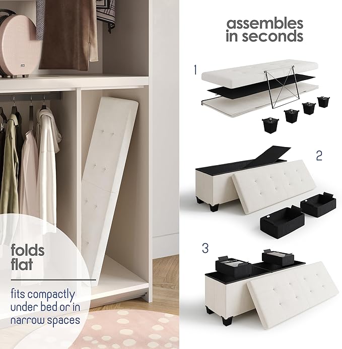 - Removable Legs: Our ottoman storage bench for bedroom and kids’ room can fold flat when not in use and measures 43” L x 15" D x 15” H when fully expanded. Adjust the height by adding or removing sturdy 2" legs, adapting this cream white ottoman to suit your storage needs.