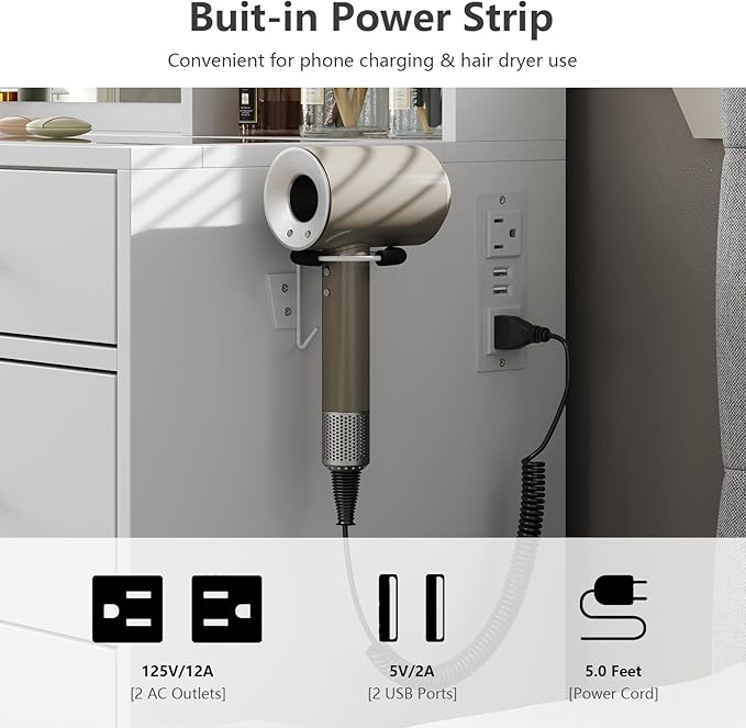 - Vanity Table with charging station: This Vanity comes with a hair dryer stand and charging station, including 2 standard plug sockets and 2 USB ports to connect your hair dryer, curling iron, computer, Ipad, mobile phone, allowing you to take beautiful selfies after applying makeup
