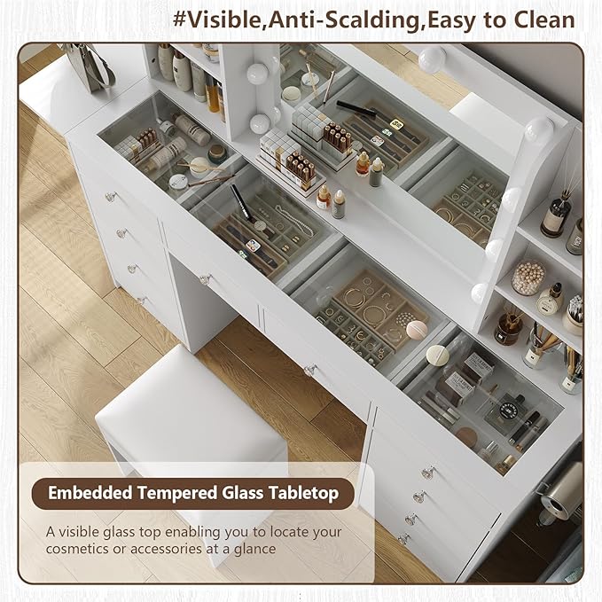- Enough Sorage Capacity: There are 10 spacious drawers and 6 shelves, it provides ample storage for all your beauty products, keeping your makeup area organized and tidy. Vanity is equipped with a foldable panel, you can open or fold up to get more space