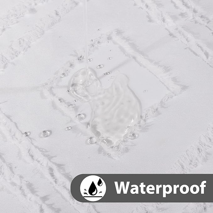 - No Hook Shower Curtain: Never worry about hooks again, this white textured shower curtain features built-in rings, no hooks required, and can be quickly installed without removing the shower curtain rod