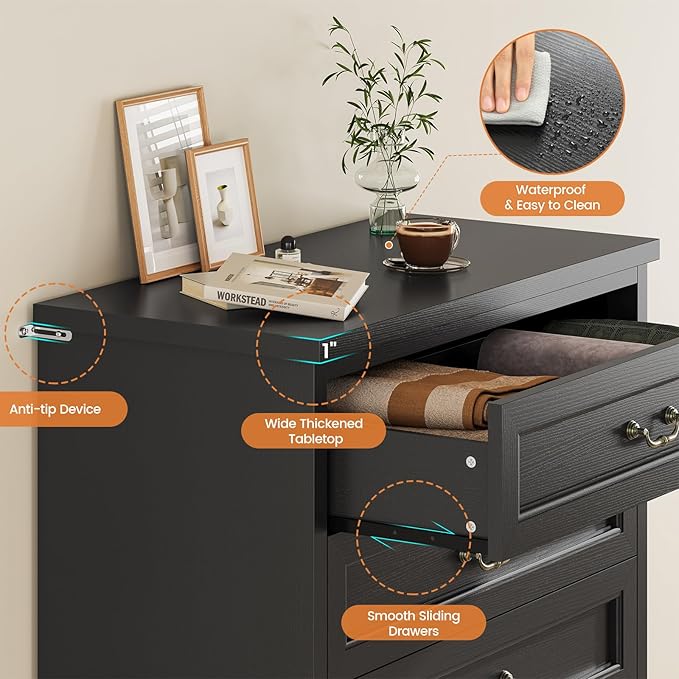- 【PREMIUN MATERIAL】This high-quality bedroom dresser is made of environmentally friendly artificial wood. All materials meet environmental standards, are non-toxic and harmless, and protect your and your family's health. High-quality wood and metal hardware ensure the durability and stability of the drawer cabinet. The surface of the drawer cabinet has been specially treated to be scratch-resistant and wear-resistant, and it can remain as good as new even after frequent use.