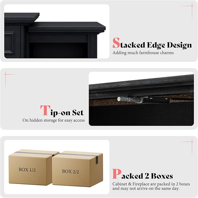 - 【Warm Tips】TV console & fireplace are packed in 2 boxes. Two people can finish assemble with 90 mins. Any questions are welcome, we are online 24 hours