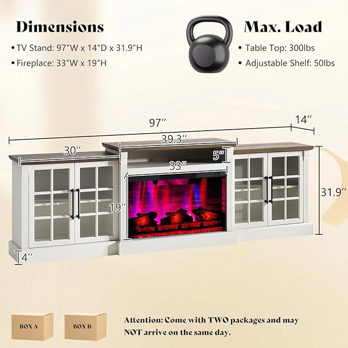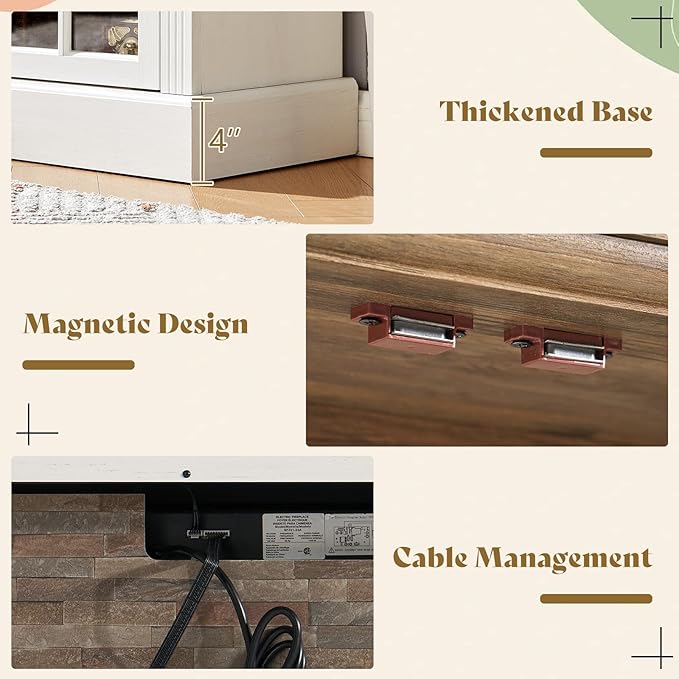 - Farmhouse Style and Aesthetic: Fireplace TV stand features clean lines and extra long top panel overhang design, complemented by glass cabinet doors with cross-beam designs and metal handles for a vintage-inspired touch