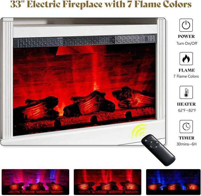 - 33" Electric Fireplace: 7 flame colors, 5 brightness levels, 62℉-82℉ temperature adjustable and independent flame operation for year-round use. It heats spaces up to 400 sq.ft. Timer (30 min-6H) and overheat protection save energy and ensure your family's safety
