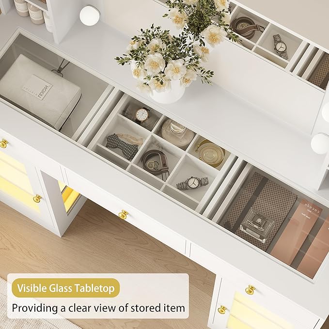 Makeup Vanity Desk with Mirror and Lights, Glass Top Vanity Table Set with Drawers & Power Outlet, Large Dressing Table with 3 Color Lighting Modes & RGB Cabinets for Women Girls Kids Bedroom, White
