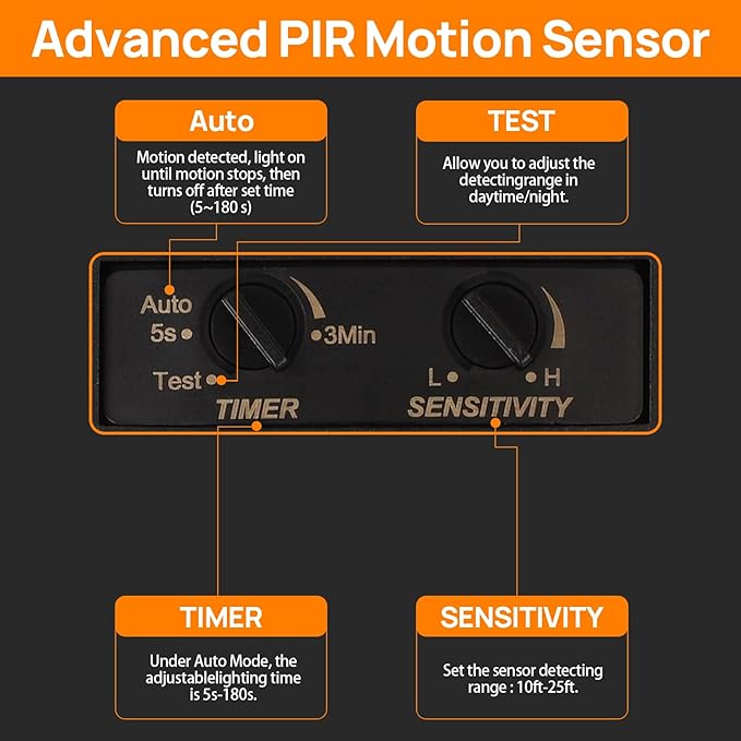 - Motion Sensor Outdoor Ceiling Light:Equipped with side-design rotary switch.You could easily adjust the sensitivity and timer of this exterior ceiling light(Providing a 5 To 180-seconds timer and a maximum 30-foot reach).