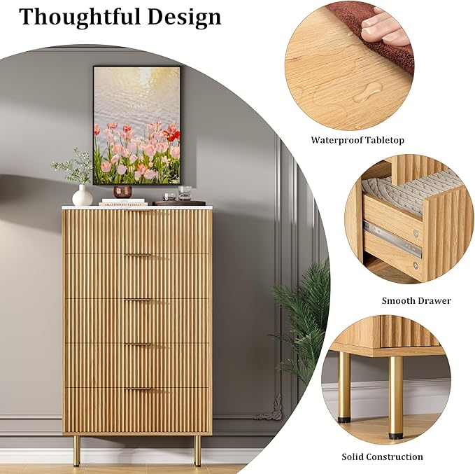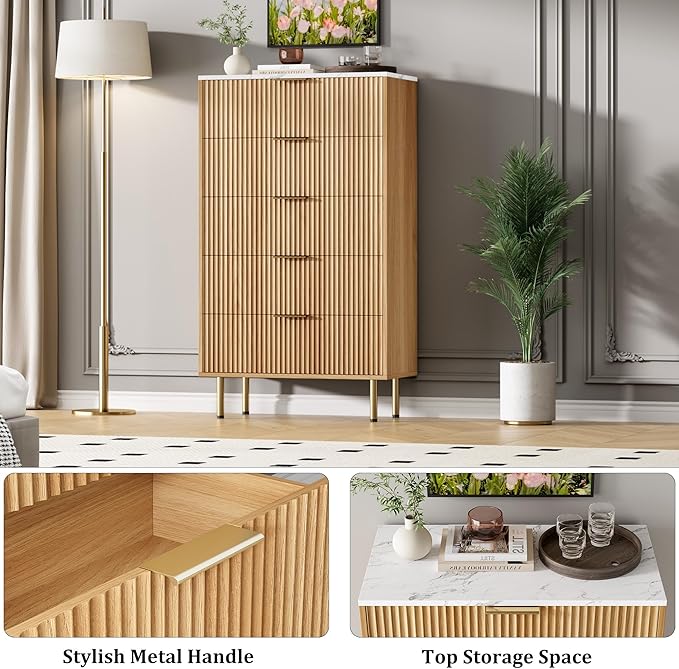 Fluted Wood Dresser 5 Drawers Dresser for Bedroom, Modern Chest of Drawers, Tall Brown Dresser with Faux Marble Top and Gold Handle, Wood Drawer Organizer for Bedroom, Living Room, Hallway, Entryway
