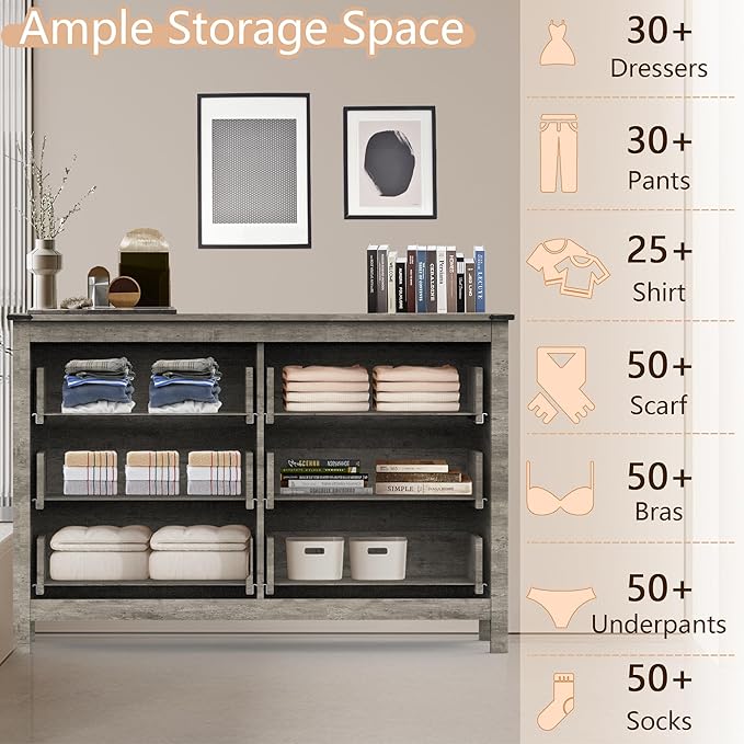 - Durable for Long Term Use: Constructed of sturdy MDF for sturdiness and durability. The top board can confidently hold up to 120 lbs, while the six drawers glide smoothly on rails, each supporting up to 30 lbs
