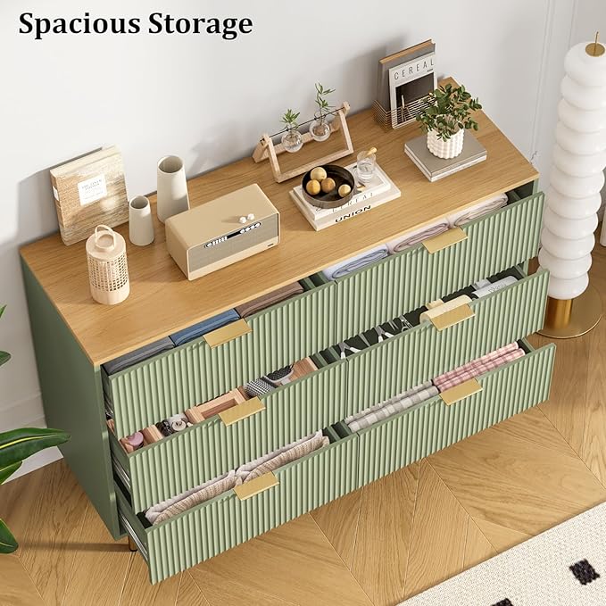 Fluted Wood Dresser 6 Drawers Dresser for Bedroom, Large Modern Chest of Drawers, for Bedroom, Living Room, Hallway, Entryway, Green and Oak