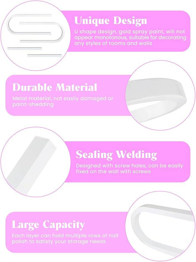 - 💅【Large Capacity & Save Space】: Exquisite u shape design to meet both of your aesthetic and storage needs. Each tier can hold a large number of nail polish, making storage convenient and help you save lots of space and time. Reasonable use of wall space, no more worrying about messy table.