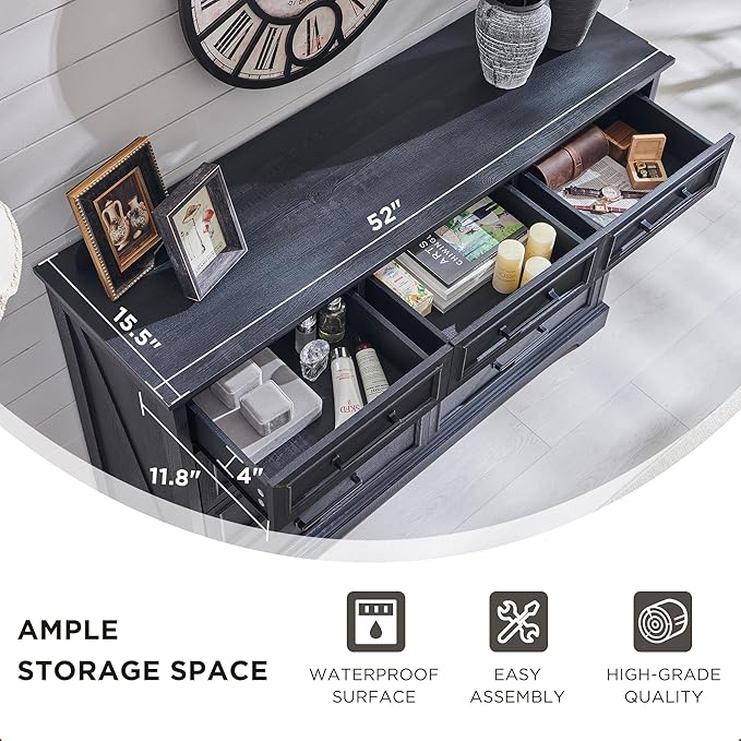 - CLASSIC DESIGN: 52"W × 16"D × 36"H, Classic points like metal hardware and weathered finishes give it timeless appeal. The dresser features decorative details all around and 9 drawers for storage. Designed to work beautifully with the other components, it creates a bedroom that is both inviting and sophisticated