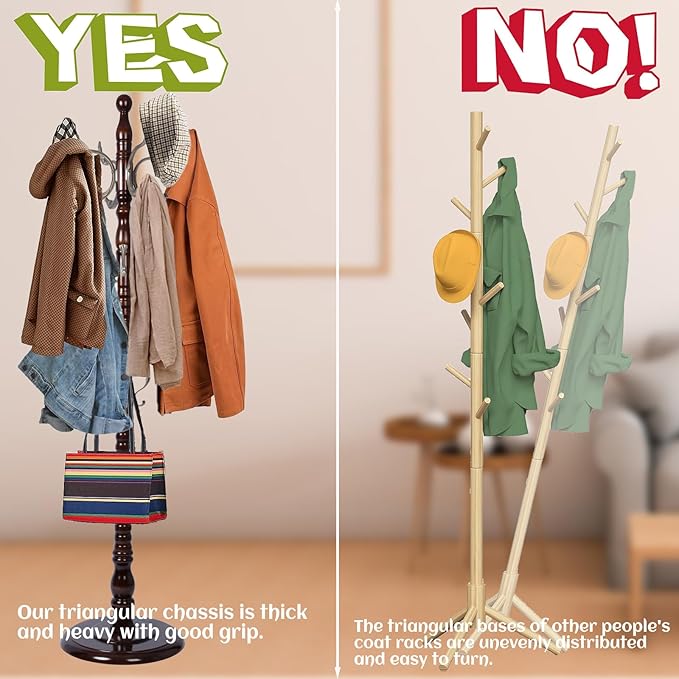 - Sturdy and Stable:The wooden coat rack is carefully selected from natural birch wood. ensures stability. exquisite resin hooks with smooth lines, hard and unbreakable. coat stands for entryway smooth and free of burrs, and it can be hung without damaging clothes