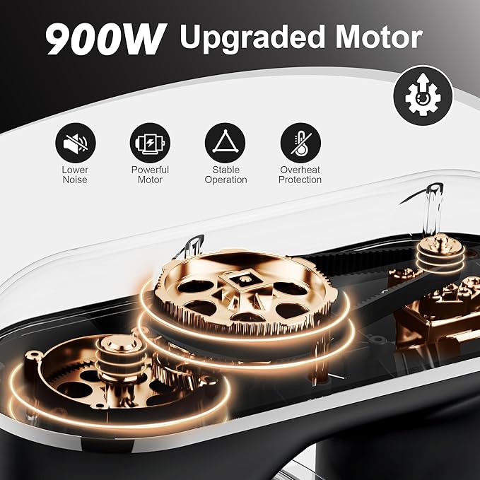 - Powerful 900W Motor-The 900W motor delivers exceptional power, effortlessly tackling thick dough, dense batters, and delicate mixtures. With smooth and consistent mixing performance, this powerful motor ensures that the stand mixer can handle even the most demanding tasks without overheating, offering long-term reliability and efficiency.