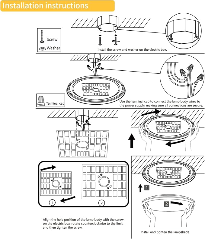 - EASY TO INSTALL:The packaging of LED ceiling lights includes all installation hardware. Very simple steps allow you to install it quickly in a very short time.Note: Power must be off before installation