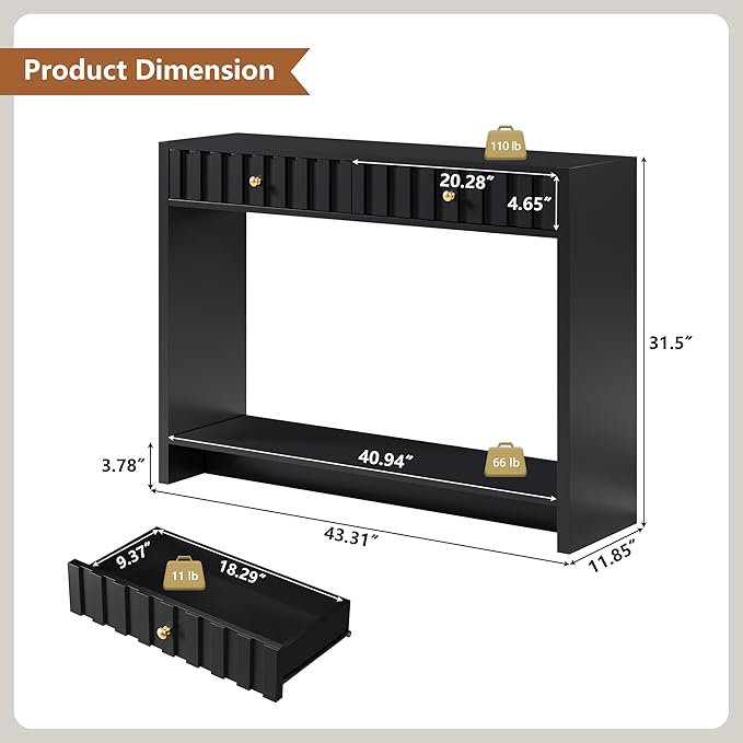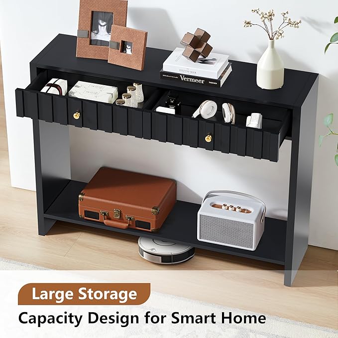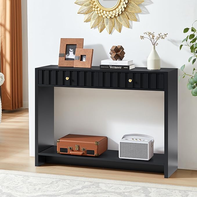 - Console Table with Storage: Maximize your space with the RUSTYER small console table, designed for both style and functionality. It includes two spacious drawers for storing keys, mail, or small accessories, while the open shelf provides additional space for decorative items or books. Keep your entryway or living room organized without sacrificing aesthetics.