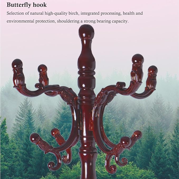 - 【Wider Application】The wooden coat tree is designed in a vintage style, with a simple structure and comprehensive functions. The coat rack can be placed in the hallway, living room, bedroom, office, and any corner you need. The wooden coat tree stand adopts an embedded screw design and is connected to the main pole, and the full-tooth screw is connected to the chassis. Equipped with installation tools and instructions, you can easily complete the installation.